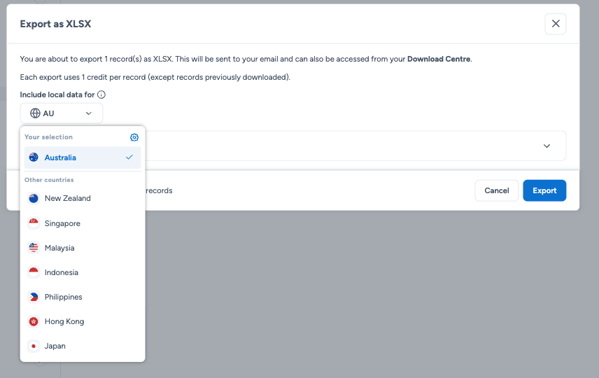 Note: The countries available to you will reflect the country scope configured on your Firmable account. If you need access to additional countries, contact your Firmable account manager.