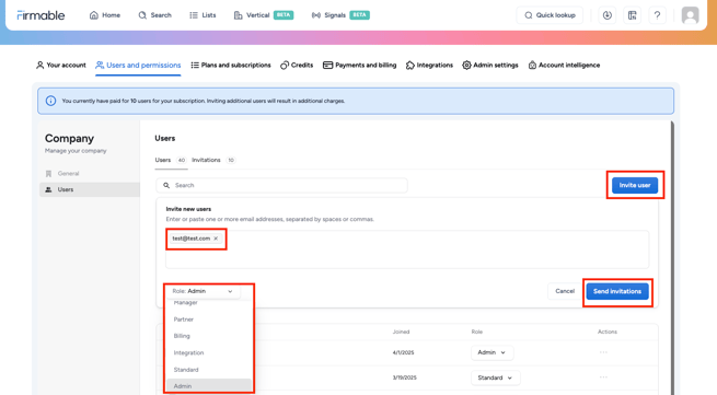 - Partner: For Firmable-certified partners to access your account. Same permissions as a Standard role. If you need to check the status of a partner, email support@firmable.com.