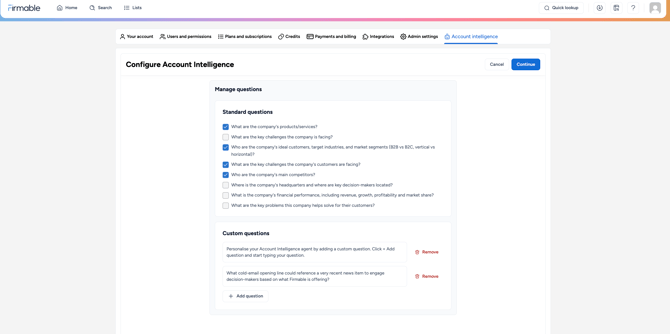 Firmable provides a standard set of questions to guide the insights. These are global by default, but Admins and Managers can customise them to match your go-to-market strategy.