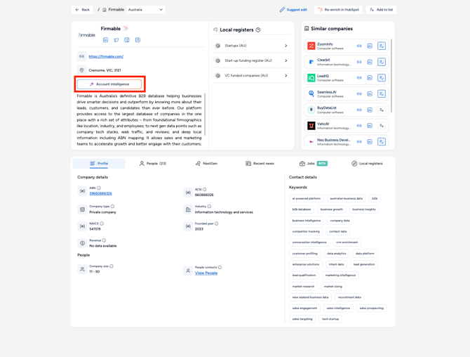 Learn more on how to set up Account Intelligence in Firmable to see personalised insights about companies to help you supercharge your prospecting and quickly research any account.