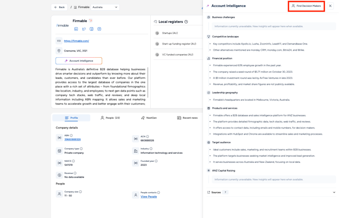 - Easily identify key stakeholders within a company by clicking Find Decision Makers.